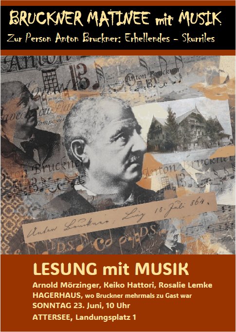1864 besuchte Anton Bruckner mehrmals den Ort am Attersee; vom 18. Juli 1864 datiert ein Eintrag Anton Bruckners im Gästebuch der Familie Hager in Attersee. Zu dieser Zeit war er noch nicht der große Symphoniker, sondern Domorganist in Linz und Komponist zahlreicher kirchenmusikalischer Werke. Einige davon werden in diesem Konzert erklingen, umrahmt von einem Fest zu Ehren des Komponisten, inkl. Beteiligung des örtlichen Singkreises und Präsentation "Anton Bruckner Bier".